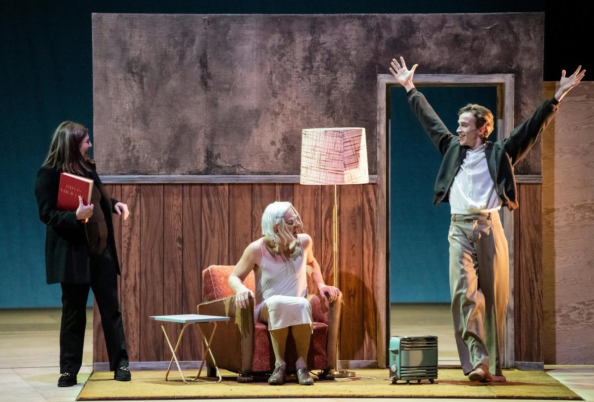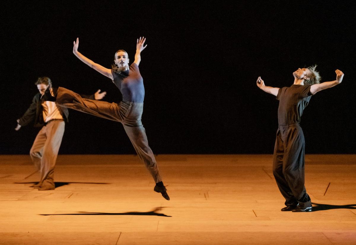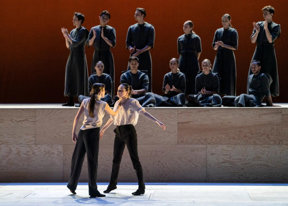 The staging mirrors the complexity of this world. A monolithic, raked wooden stage transforms as hidden rooms, corridors, and trees rise and vanish - “desks and walls lifted, chairs sinking into the floor, a landscape in constant motion.” Movement and text are inseparable: roles double and split, psychology becomes physical, and even computation is choreographed as dancers embody the mimetic feedback loops that drive social media.