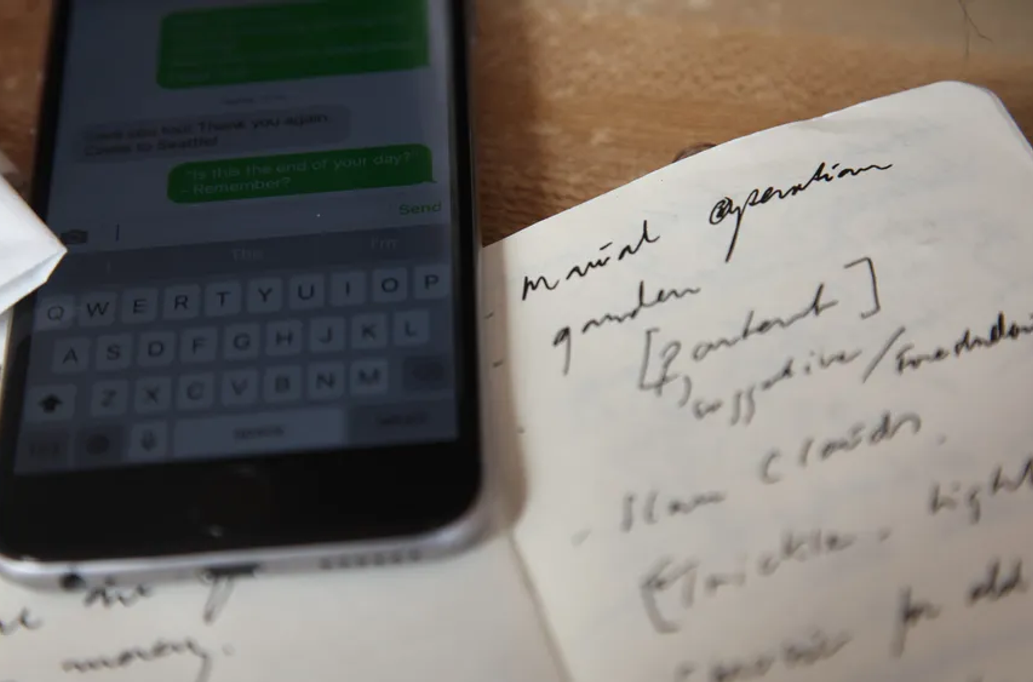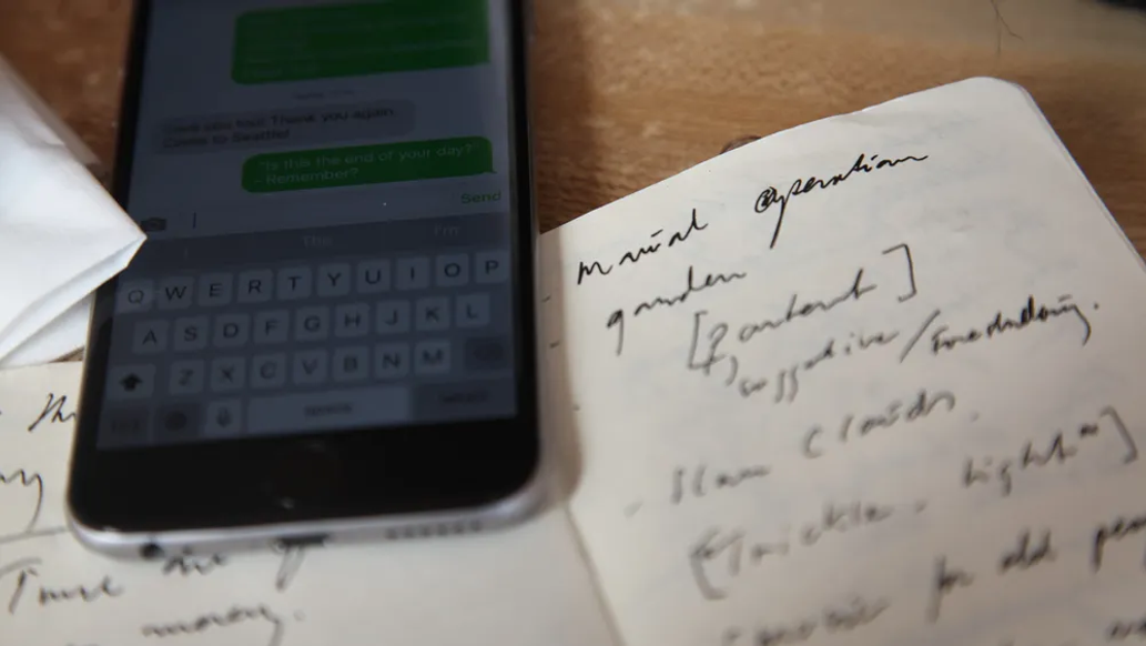 Nearing five (when our day ends) we seem to have ended in a Gordian knot - unable to figure our way from scene three (the airport express) to scene four (Cape Cod beach). The work is exacting and the actors are losing lines they knew only a few minutes ago - we’re clearly all tired. Quite abruptly, and quietly, Alan tells us the head-rush has not passed, and that he has a strange sensation in his left arm. We assume low blood sugar, and feed him honey (which he can’t abide) but his conditions worsens.