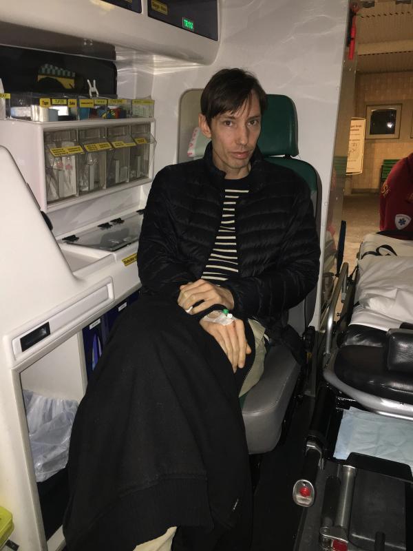 An executive decision is made to call an ambulance. When I describe his symptoms, the emergency operator tells me to stay with the patient (who is surrounded by half a dozen calm, concerned and loving company and family members), and that an ambulance is on it's way. Alan does not argue, and this I take as a sign that he is very poorly. Yvonne puts him into the recovery position, and I take his pulse as I speak to the emergency operator. I guess we have all seen enough American movies to know what to do. Thank god. Notwithstanding his ashen face, and very slow pulse, Alan is able to whisper to Andrew “Take pictures!”.