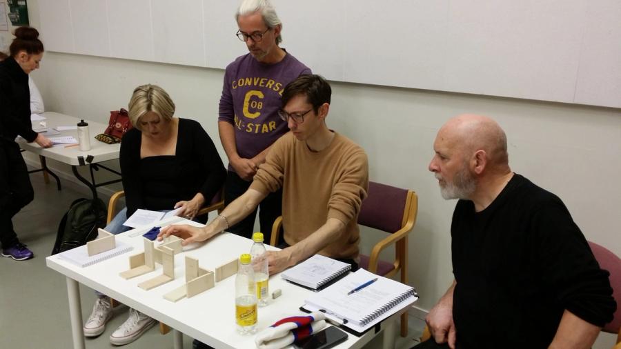 We've put two scenes 'on the floor', reminding ourselves that we'll be joined by a number of other company members tomorrow, so the blocking is a rough sketch for now. The other company members are Åsmund's 'L" shaped blocks.