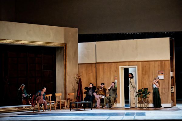 A charged confrontation unfolds between Héléna Pikon and Alexandre Boccara as mother and son. After a family meal, the son breaks, lashing out at his mother’s suppression of feelings. It was Boccara’s first acting role on the Garnier stage.